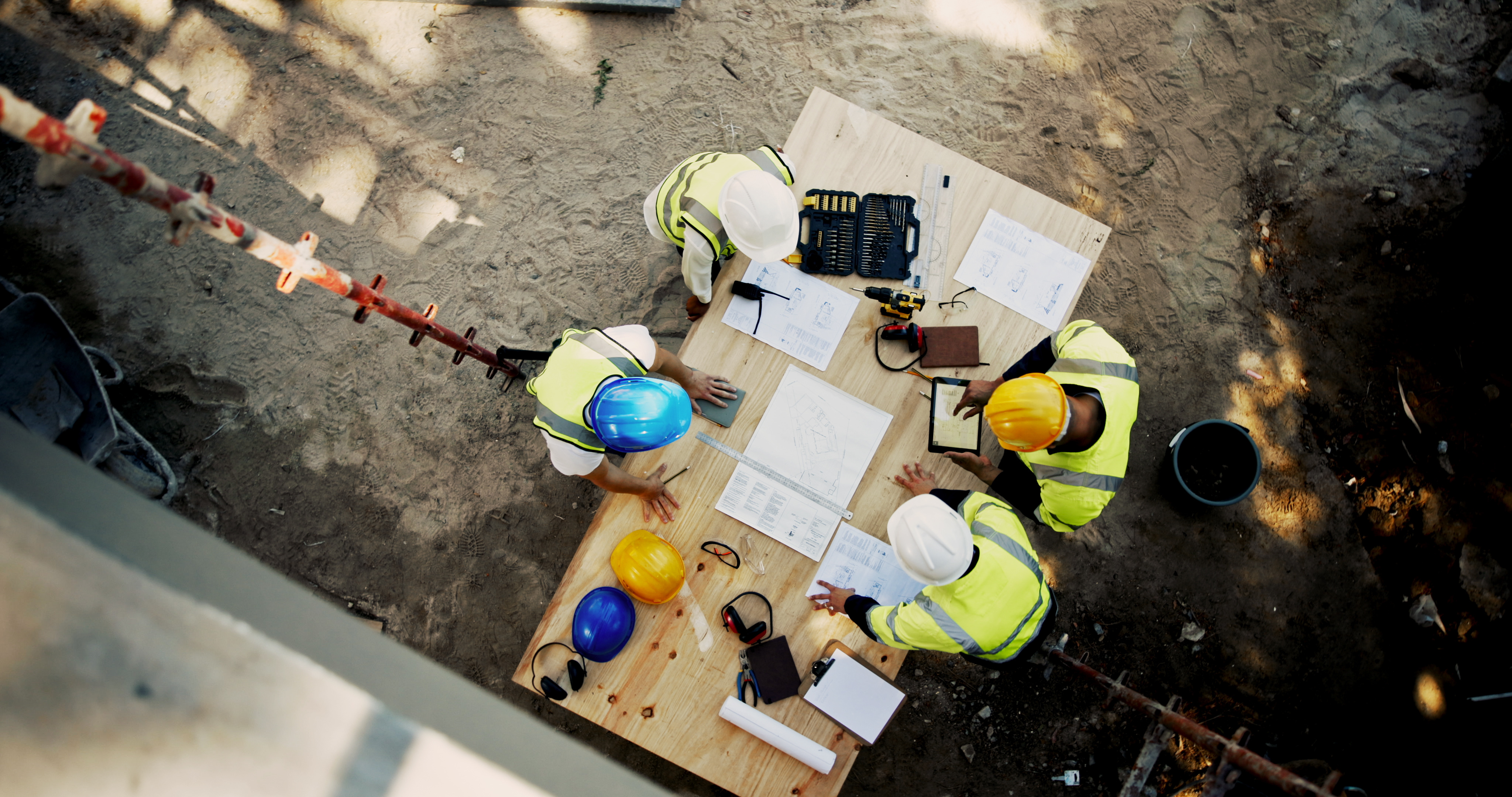 Architecture, tablet and business people with blueprint for construction site, building and planning. above, engineer team and employees with ideas for industry renovation, infrastructure and meeting